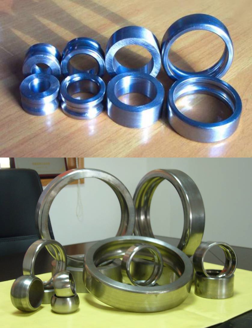 GCr15 轴承钢含碳量为 1.0%,属于高碳钢,塑性差,变形抗力大,难以冷轧环成形。GCr15 轴承钢室温冷轧成形是国际高性能轴承环先进制造技术发展方向,我国经过深入研究开发,发明了球轴承环精密冷轧成形方法和滚子轴承环冷轧成形方法,攻克了 GCr15 轴承钢室温冷轧高塑性预处理、长寿命轧辊孔型设计制造、精密冷轧环过程控制等关键技术,突破了高碳轴承钢冷轧成形的技术禁区。精密冷轧直接成形轴承滚道,精度为 6~7 级,高出国际先进水平 1~2 级。精密冷轧轴承环,节省了大量切削加工,节材 15%~20%,滚道内部组织细密,金属流线分布合理,显著提高轴承寿命。此外,自主研发了新型数控精密冷轧环机,创新性地研究设计了伺服电动机-减速器-强力滚珠丝杠机构,取代液压伺服系统作为冷轧环机主传力进给系统,解决了爬行和零飘问题,保持了机电伺服进给系统精密进给优点,实现了 50 t 重载塑性变形条件下的轴承环冷轧精密进给,进给精度达到 0.005 mm,加工精度达到φ 100 mm±0.05 mm,高于德国和日本同类型精密冷轧环机加工精度φ 100 mm±0.1 mm。应用精密冷轧技术和装备批量生产的轴承环不仅替代进口,还大量出口瑞典 SKF、德国 FAG、日本 NSK、美国 TIMKEN 等国际著名轴承公司,实现了轴承环制造从热锻低性能粗坯到冷轧高性能精坯的重大技术突破。精密冷轧成形的典型轴承环如下图 所示。
