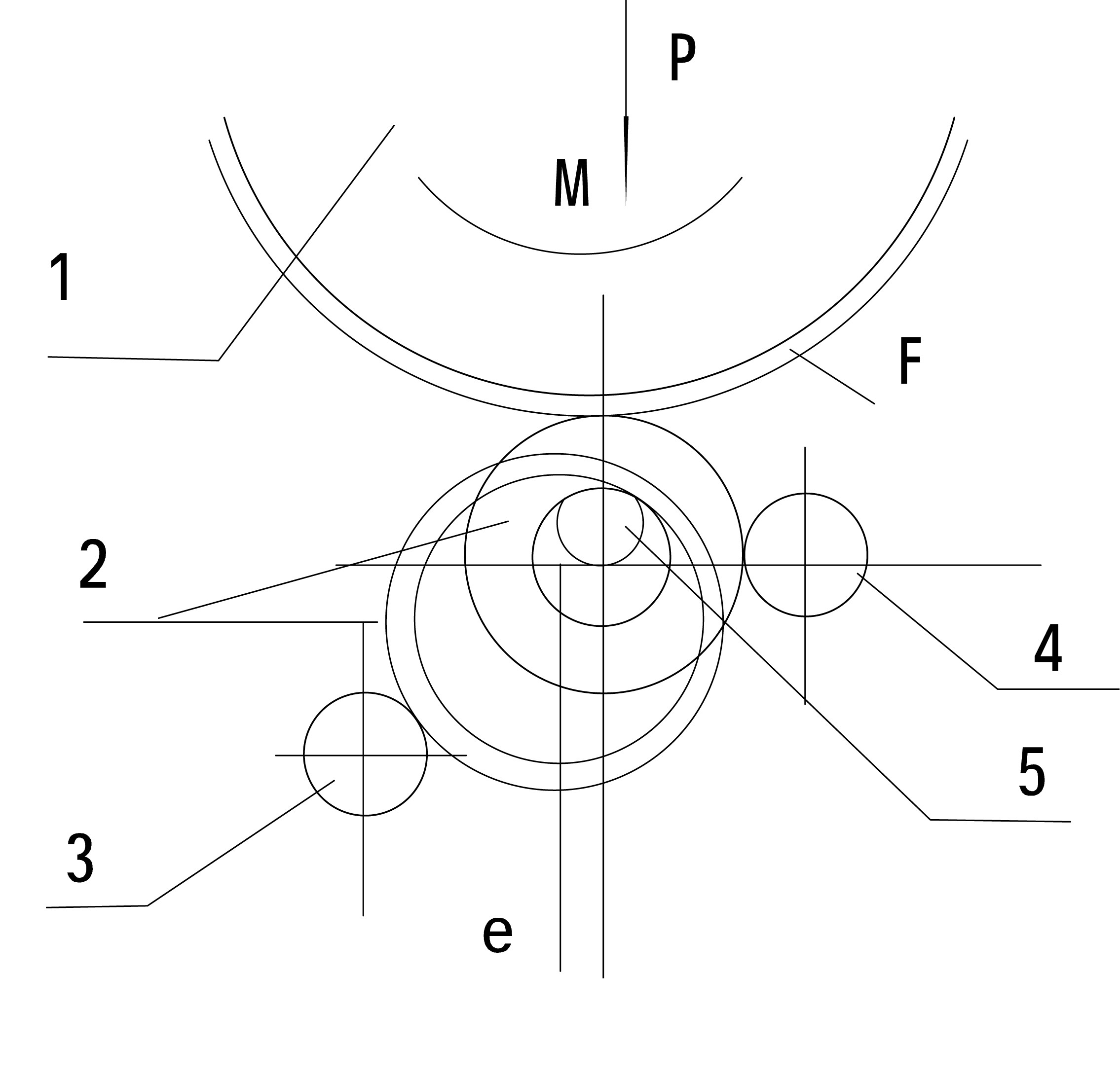 辗环机工作原理如上图所示。温度符合要求的环坯2套到辗压辊5上,旋转着的辗压轮1在油缸力P的作用下向下运动,与环坯接触后,环坯开始变形。此时环坯和碾压辊在摩擦力F的作用下旋转,环坯受到压缩,壁厚逐渐减薄,金属沿切线方向延伸(轴向也有少量展宽),环坯的延伸变形处于自由状态。当环坯外径与固定的推力辊4接触后,推力辊的反作用力使环坯外径增大的同时,产生弯曲变形,将环坯的几何中心推向机器中心线的左方,并使辗扩过程平稳地进行。当环坯的外径增大到予先调整好的信号辊3时,辗压轮即可向上回程,锻件卸出,完成一次工作循环。